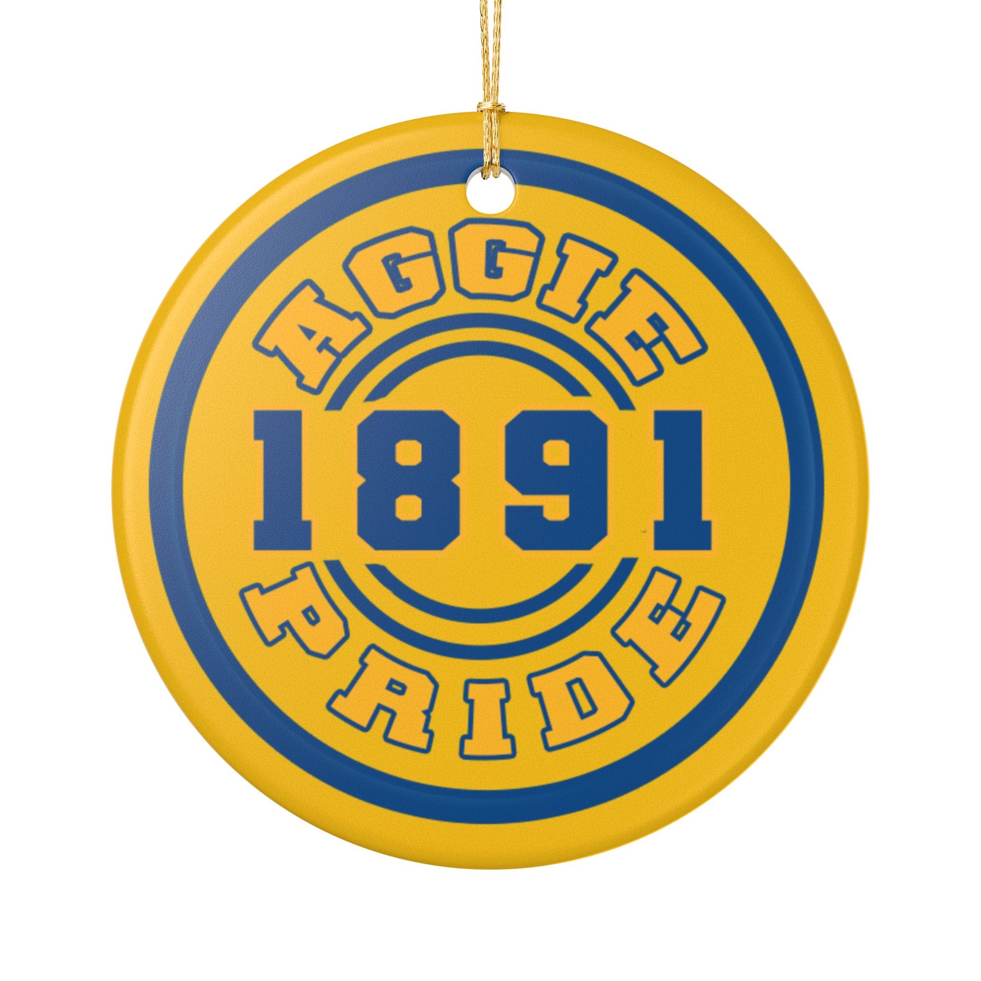 If you do what Aggies do, and strive while here on earth, all loyalty to yield, with mind in hand this glossy ceramic ornament celebrating school spirit with a bold retro badge design is for you. The round ornament shows a vintage collegiate ring and large numerals set against a vibrant gold background and contrasting blue lettering. Lightweight yet sturdy, it hangs from a golden string and shows the same crisp print on both sides — a small keepsake that brings a pop of color and nostalgic pride to a tree, locker, or dorm common area. Each piece is individually UV-printed for durable color and finished with a matte print overlay for subtle texture.