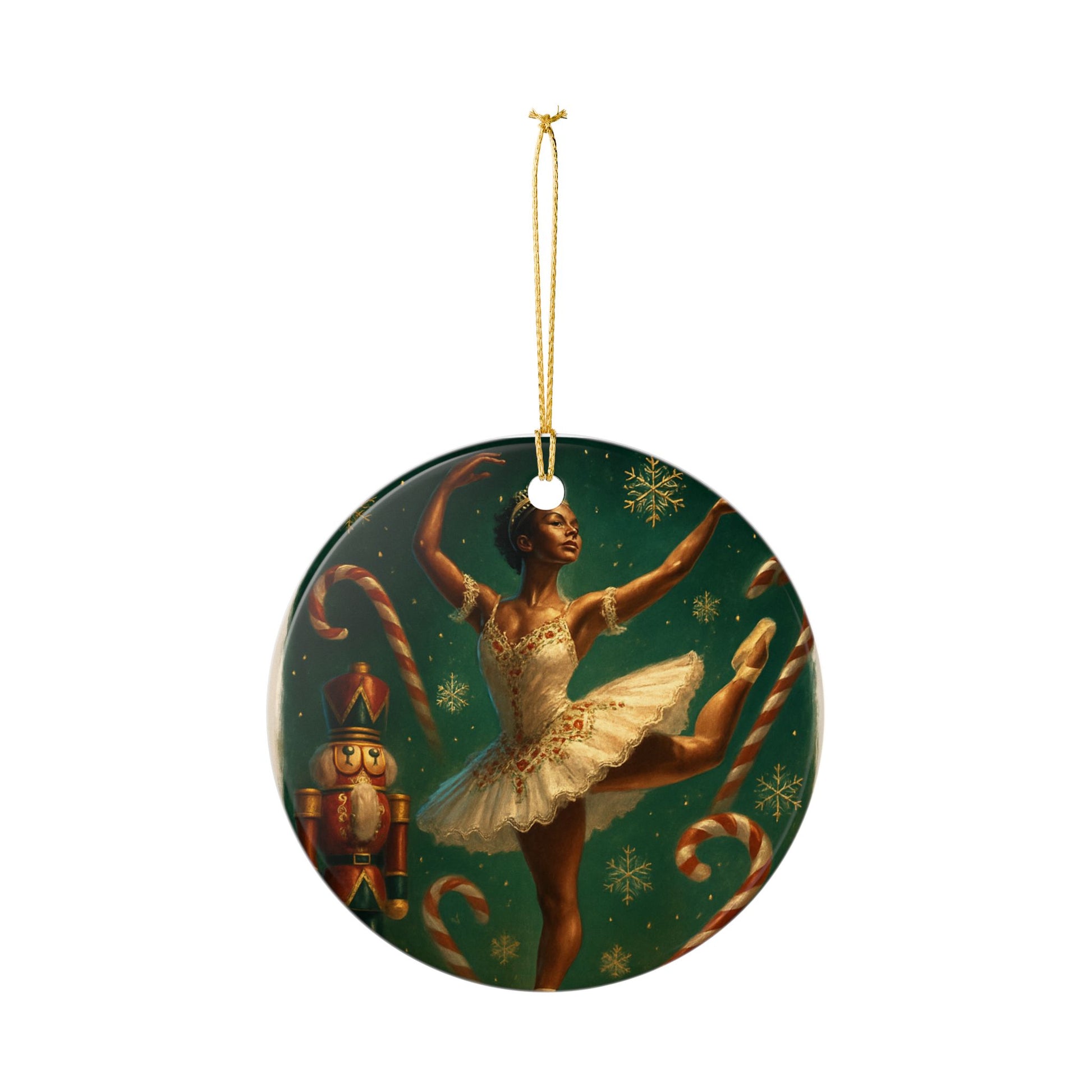 If you're having sugarplum dreams and aren't afraid of the mouse king, this ornament is for you. An homage to black ballerinas past and present, this ceramic ornament brings a quiet, elegant moment to holiday décor. The round, glossy white ceramic disk features a matte-printed scene of a graceful ballerina poised among candy canes, snowflakes, and a vintage nutcracker — warm, nostalgic imagery that reads like a page from a storybook. Hung by the included gold string, it catches the light and adds a refined, artistic touch to a tree, wreath, or mantel. It feels like an intimate scene from a holiday performance, a small keepsake that evokes childhood wonder and the hush before the first musical note.