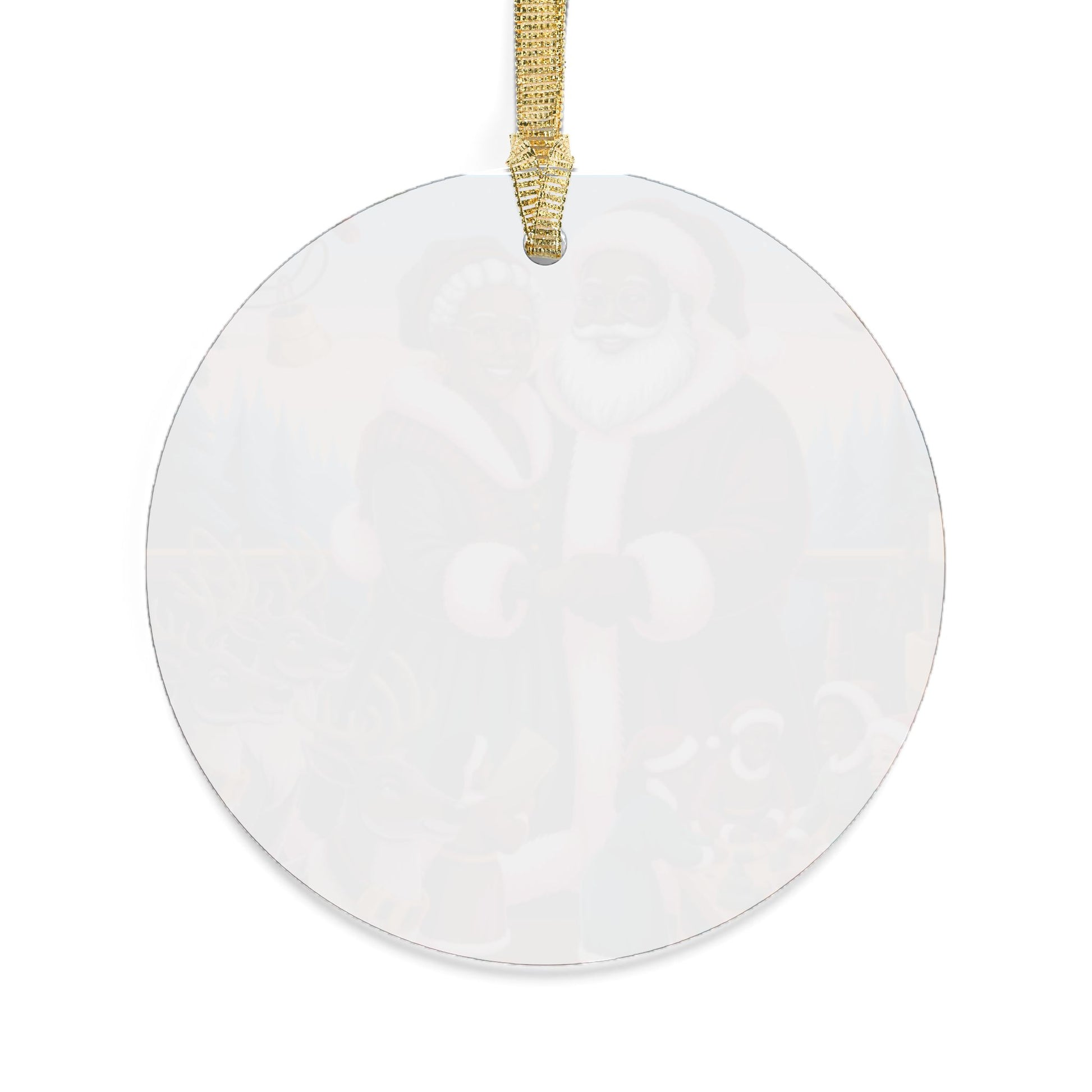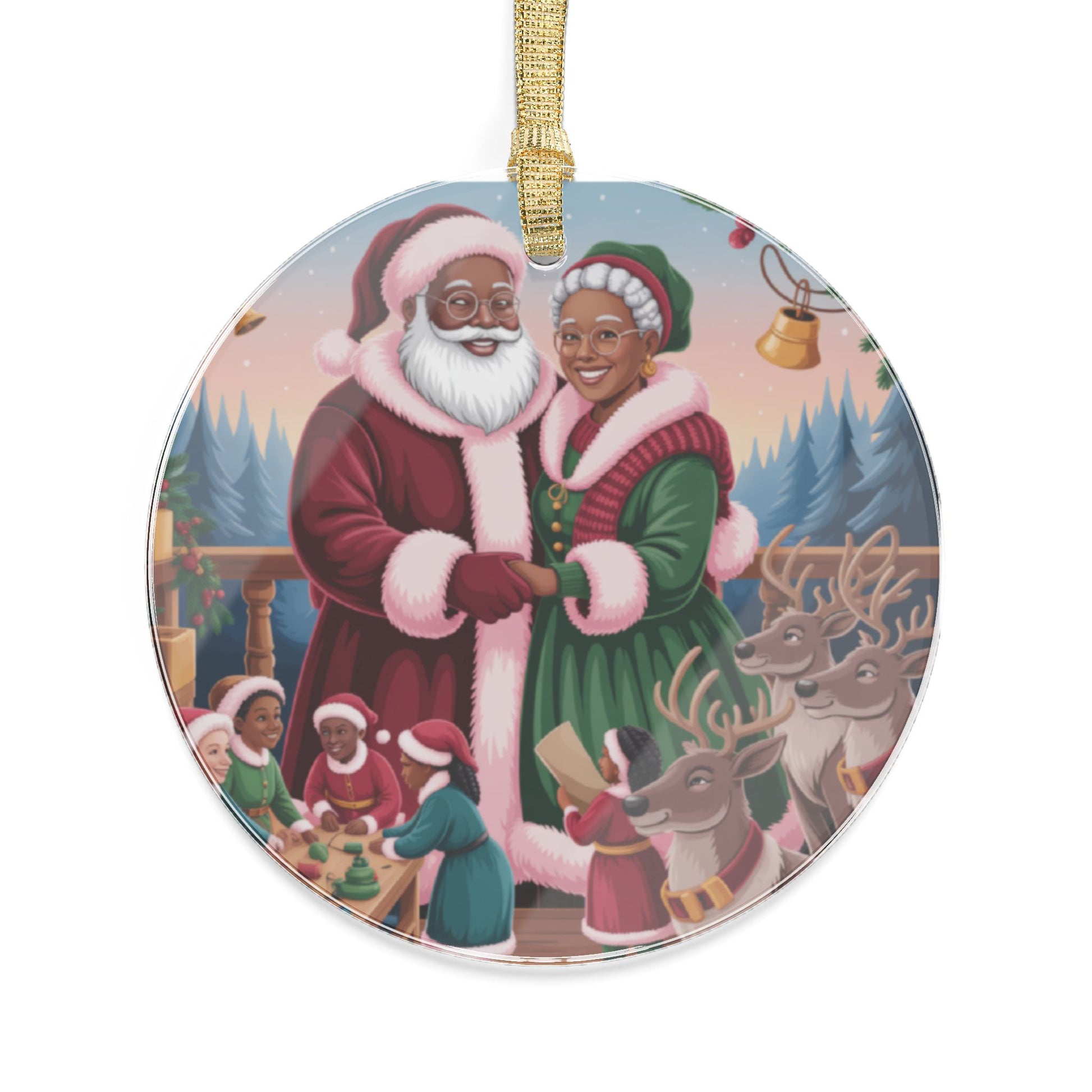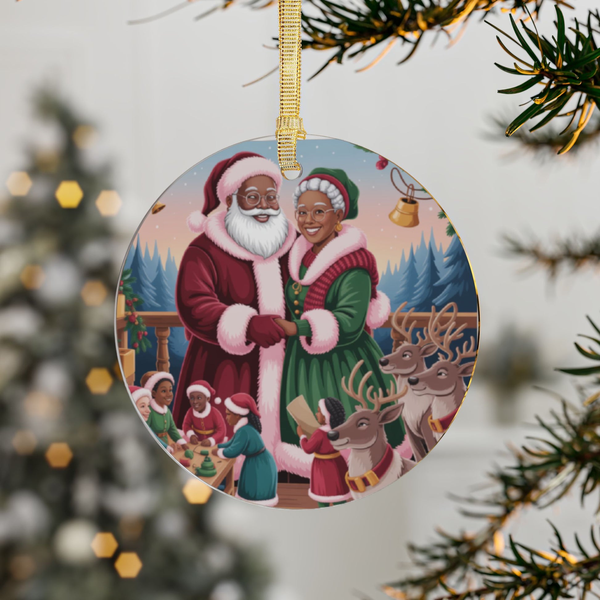Celebrate your heritage and spread holiday joy with this beautifully designed African American Christmas ornament featuring a joyful Black Santa, Mrs. Claus and the elves hard at work. A perfect way to bring representation, warmth, and pride to your Christmas tree this season.